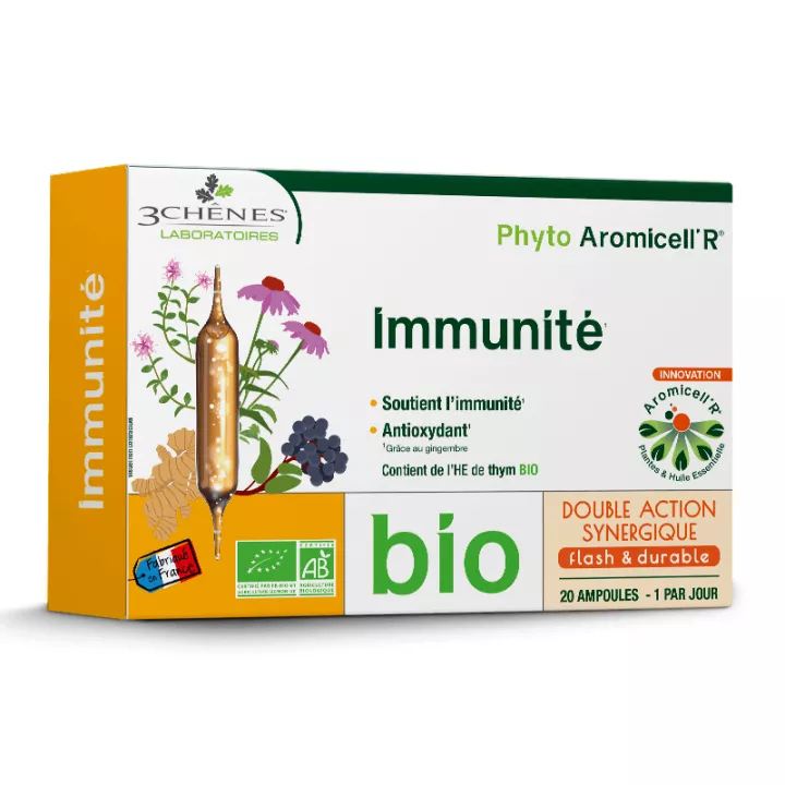 3-Chênes Phyto Aromicell'r Bio Immunité 20 ampoules agit sur les défenses immunitaires.
