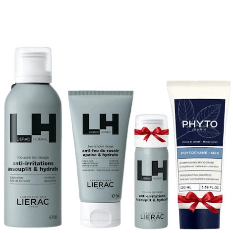 PROFITEZ DE L'OFFRE EXCLUSIVE LIERAC HOMME. TRAITEMENT ANTI-CHUTE PHYTOCYANE 100ML + TROUSSE ET MOUSSE DE RASAGE 50ML OFFERTES. ROUTINE COMPLÈTE CHEVEUX ET VISAGE