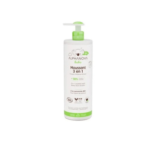 Découvrez le Gel Moussant 3-en-1 Alphanova Bébé Bio (400ml). Une formule douce, sans savon, pour laver corps et cheveux tout en créant une mousse relaxante