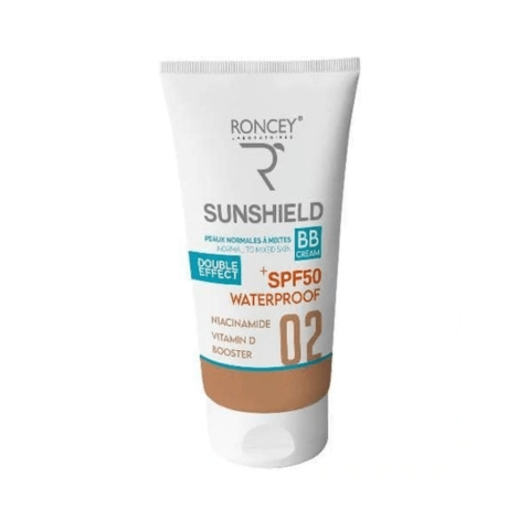 Protégez votre peau avec l'écran solaire Roncey Sunshield SPF50+. Spécialement conçu pour les peaux mixtes, teinte 02. Fini non gras et protection UV maximale.