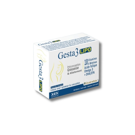 Xen Gesta 3 Lipo est un complément alimentaire spécialement conçu pour répondre aux besoins nutritionnels accrus de la femme pendant la grossesse et l'allaitement. Ce boîtier de 30 gélules utilise une technologie liposomale avancée qui encapsule les nutriments pour garantir une absorption maximale par l'organisme. Sa formule associe trois éléments clés : les Oméga-3 (DHA), l'Acide Folique (Vitamine B9) et la Vitamine D3, essentiels pour le bon développement du fœtus et la santé de la mère.